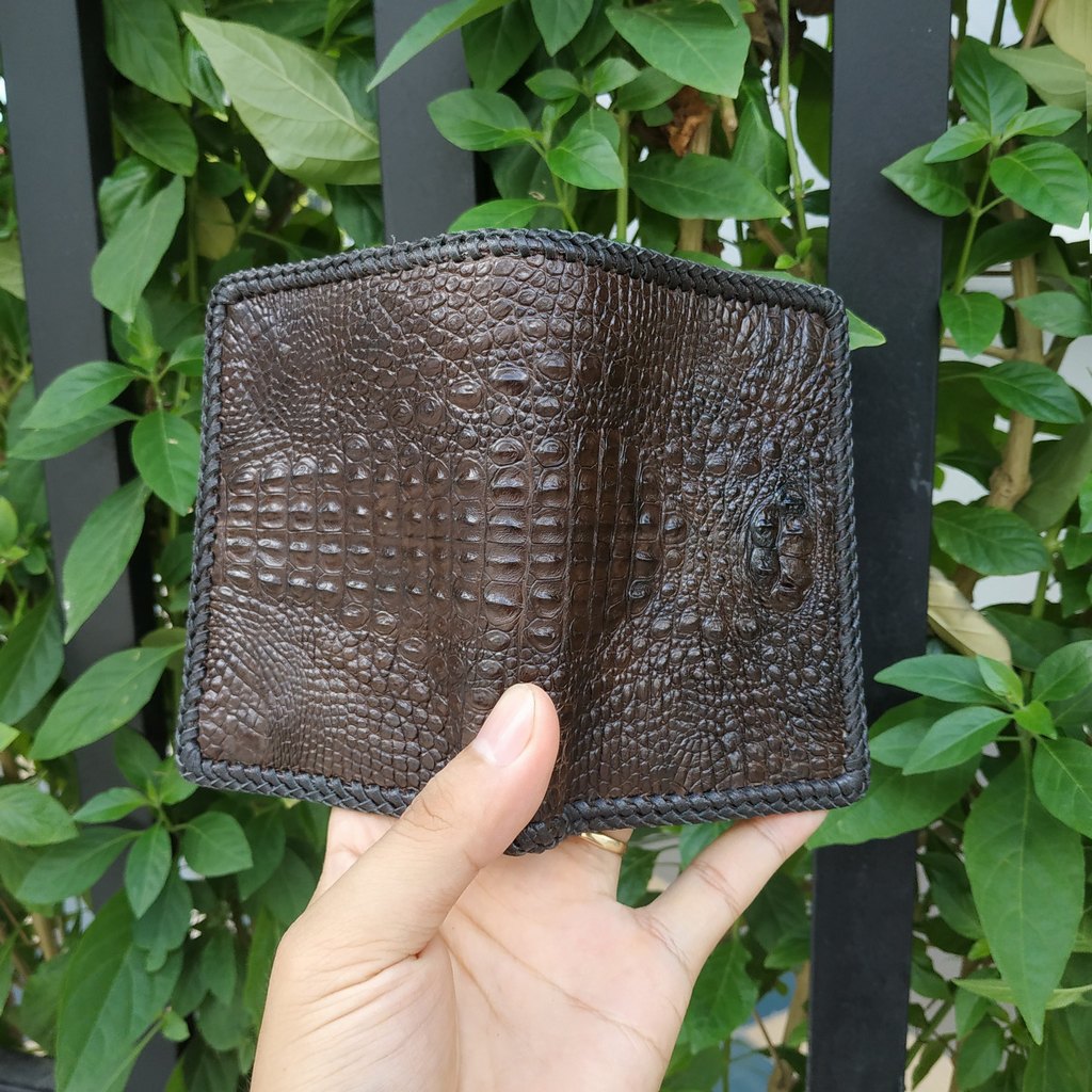 - Mẫu ví VS2V15N bạn đang xem được làm từ gù xuống lưng của cá sấu nguyên con nhỏ, những cái gù nhô lên ở mặt trước và những hàng gai lưng chạy song song ở mặt sau của ví đang hình thành xương của cá sấu. Nên nếu dùng ngón tay ấn vào gù và gai lưng sẽ thấy cứng tựa xương cá. Còn nếu là hàng da bò dập vân cá sấu/giả da cá sấu thì những cái gù và hàng gai lưng được khuôn tạo hình dập lên từ da bò (bản chất vẫn là da không phải là xương) nên sẽ mềm, ấn vào có độ nún chứ không chắc chắn.