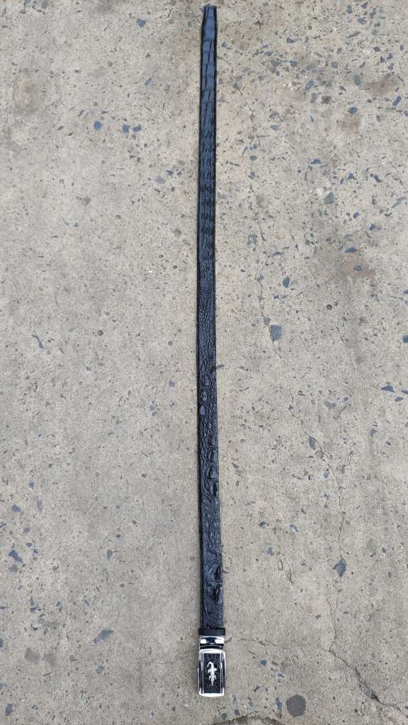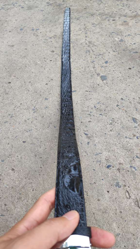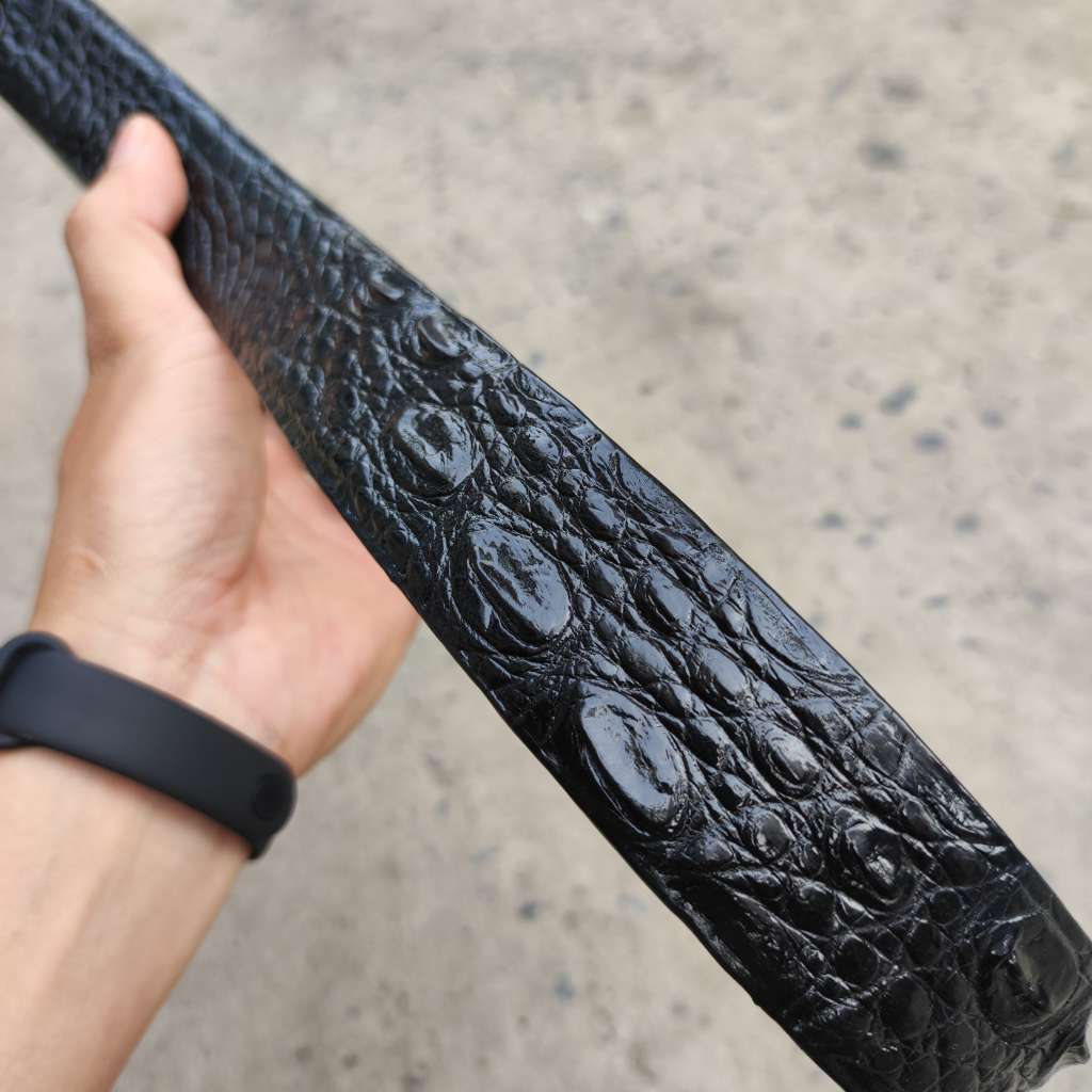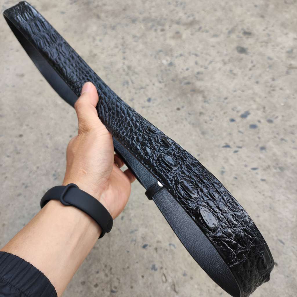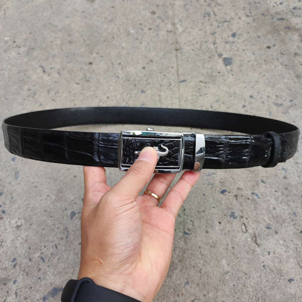Thắt lưng da cá sấu nguyên con chạy từ gù cổ chéo sang hông đến bụng của cá sấu. Mặt khóa tì tự động không rỉ sét. Dạng dây đặc biệt dành cho khách hàng thích sự đơn giản không vướng vây cá, nhưng vẫn chất cá sấu nhờ giữ lại chúc gù gai trên phần đầu của dây