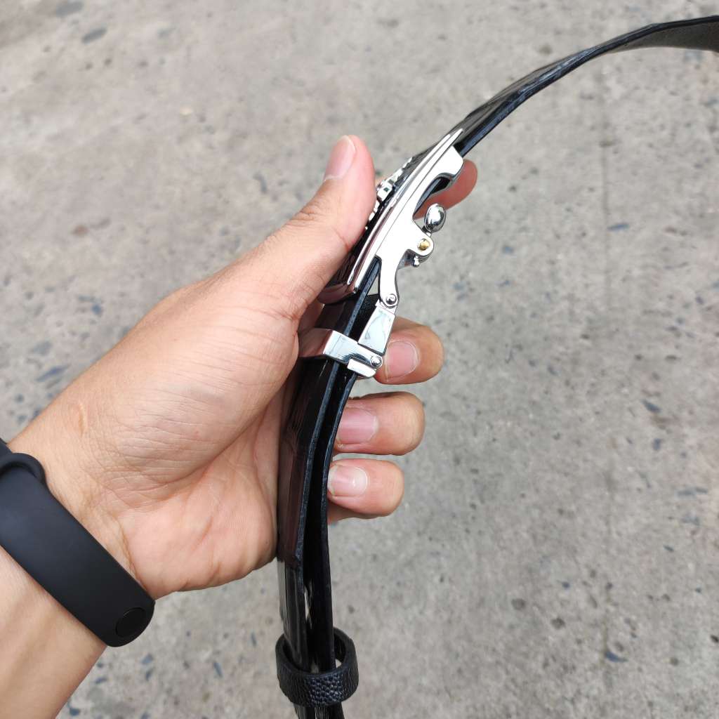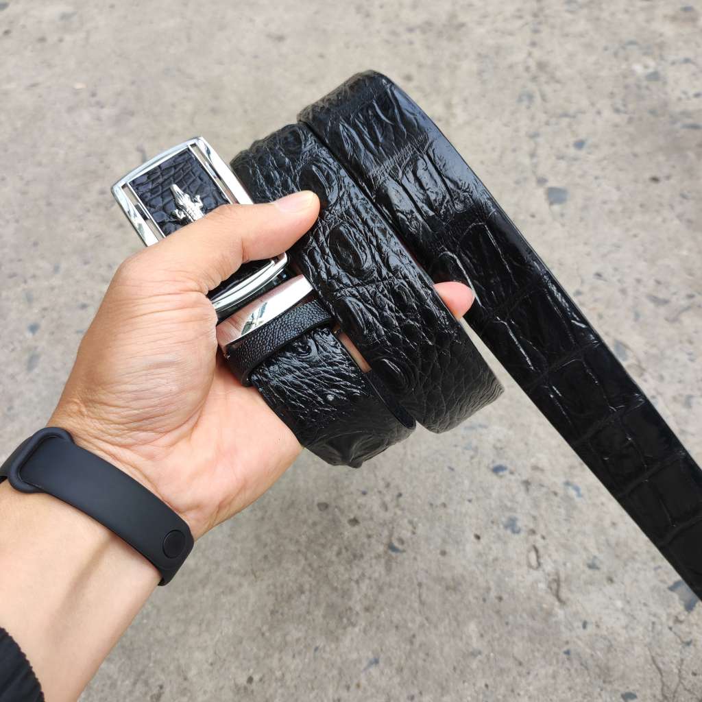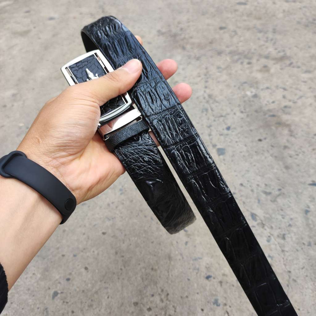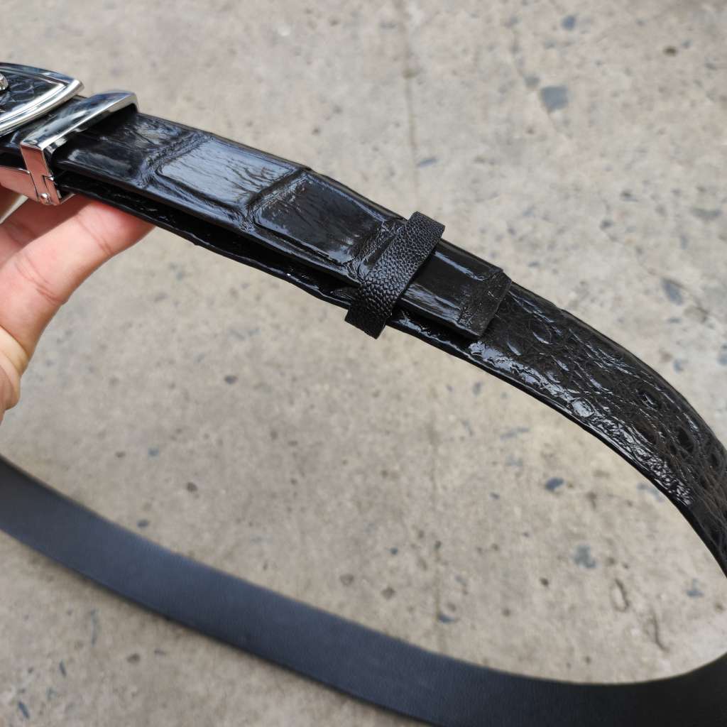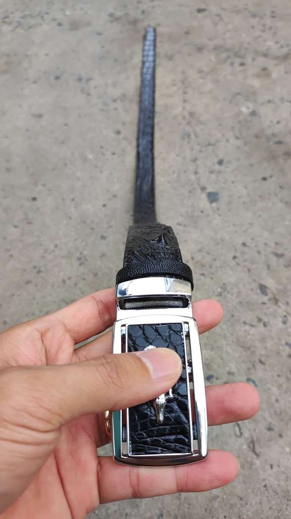 Thắt lưng da cá sấu nguyên con chạy từ gù cổ chéo sang hông đến bụng của cá sấu. Mặt khóa tì tự động không rỉ sét. Dạng dây đặc biệt dành cho khách hàng thích sự đơn giản không vướng vây cá, nhưng vẫn chất cá sấu nhờ giữ lại chúc gù gai trên phần đầu của dây