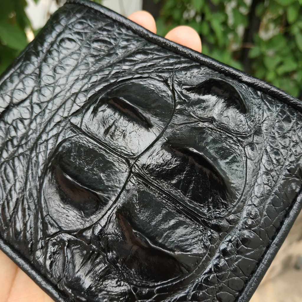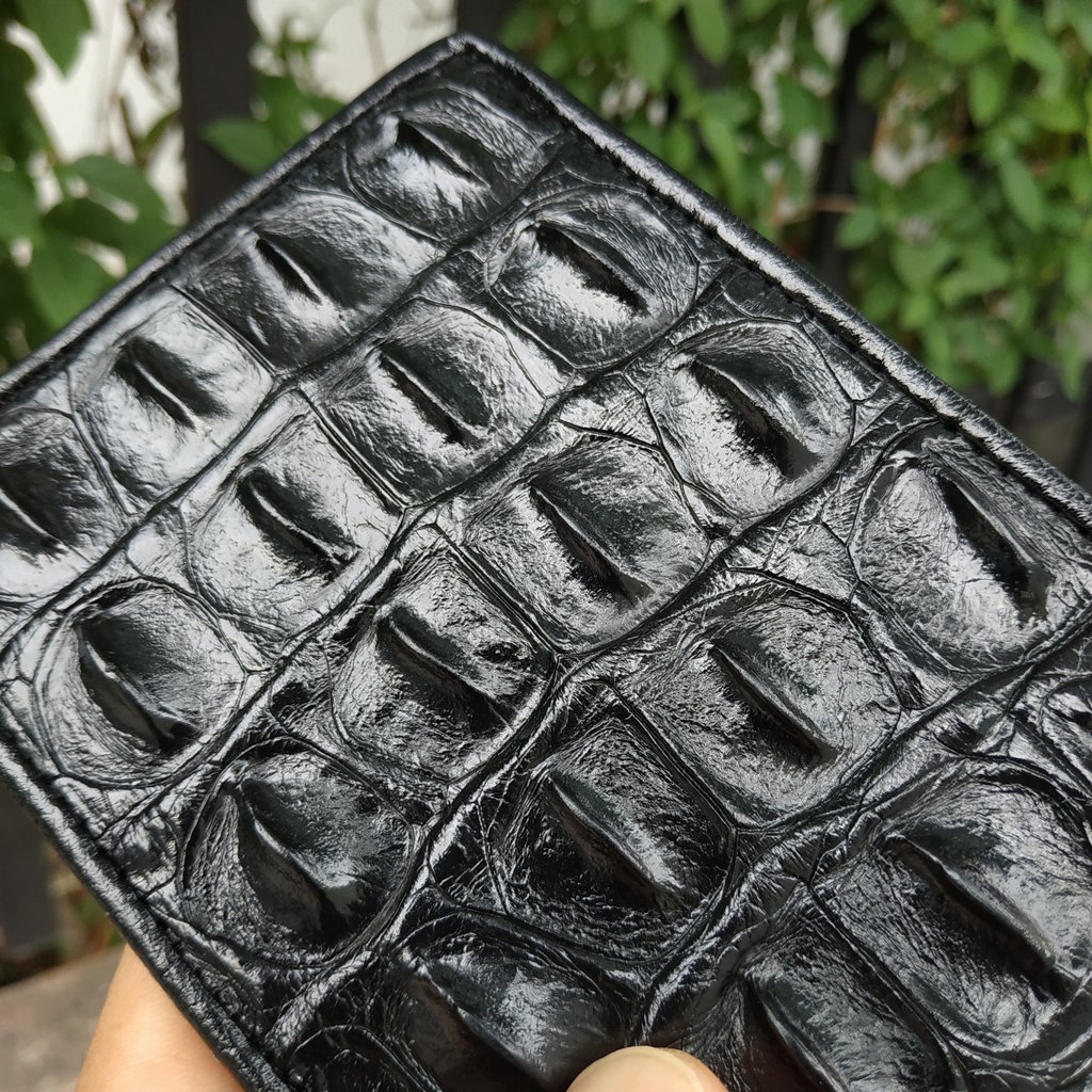- Mẫu ví VS102N+ bạn đang xem được làm từ gù xuống lưng của cá sấu lớn, những cái gù tròn nổi ở mặt trước và những hàng gai lưng chạy song song ở mặt sau của ví đều đã hình thành xương của cá sấu. Nên nếu dùng ngón tay ấn vào gù và gai lưng sẽ thấy rất cứng vì đó là xương cá. Còn nếu là hàng da bò dập vân cá sấu/giả da cá sấu thì những cái gù và hàng gai lưng được khuôn tạo hình dập lên từ da bò (bản chất vẫn là da không phải là xương) nên sẽ mềm, ấn vào có độ nún chứ không chắc chắn.