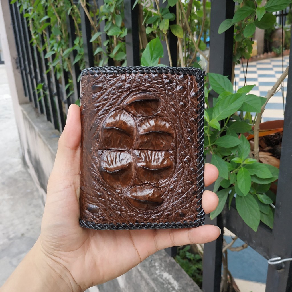 - Mã ví VS2V1N bạn đang xem được làm từ gù xuống lưng của cá sấu lớn, những cái gù tròn nổi ở mặt trước và những hàng gai lưng chạy song song ở mặt sau của ví đều đã hình thành xương của cá sấu. Nên nếu dùng ngón tay ấn vào gù và gai lưng sẽ thấy rất cứng vì đó là xương cá. Còn nếu là hàng da bò dập vân cá sấu/giả da cá sấu thì những cái gù và hàng gai lưng được khuôn tạo hình dập lên từ da bò (bản chất vẫn là da không phải là xương) nên sẽ mềm, ấn vào có độ nún chứ không chắc chắn.